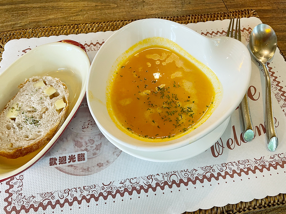 左上角則是馬鈴薯麵包和番茄蔬菜湯。 看起來雖然普通,但每種東西都經過細心的調味,一咬下去令人震驚,
